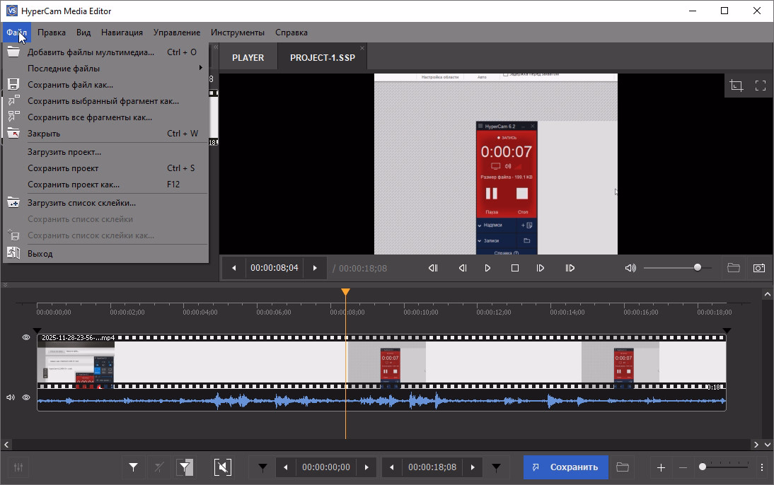 Программе абсолютно не важно, что Вы делаете за компьютером, она способна захватить абсолютно всё, и сохранить это в один из следующих видео форматов: AVI, WMV/ASF. Более того, используя её можно очень легко внести изменения в уже отснятый материал, то есть отредактировать его. С HyperCam можно создавать видео презентации, различные обучающие пособия. Радует и то, что можно выбирать область для записи, то есть можно записывать как всю область, так и отдельное окно. При необходимости запись можно поставить на паузу, а затем снова продолжить записывать.